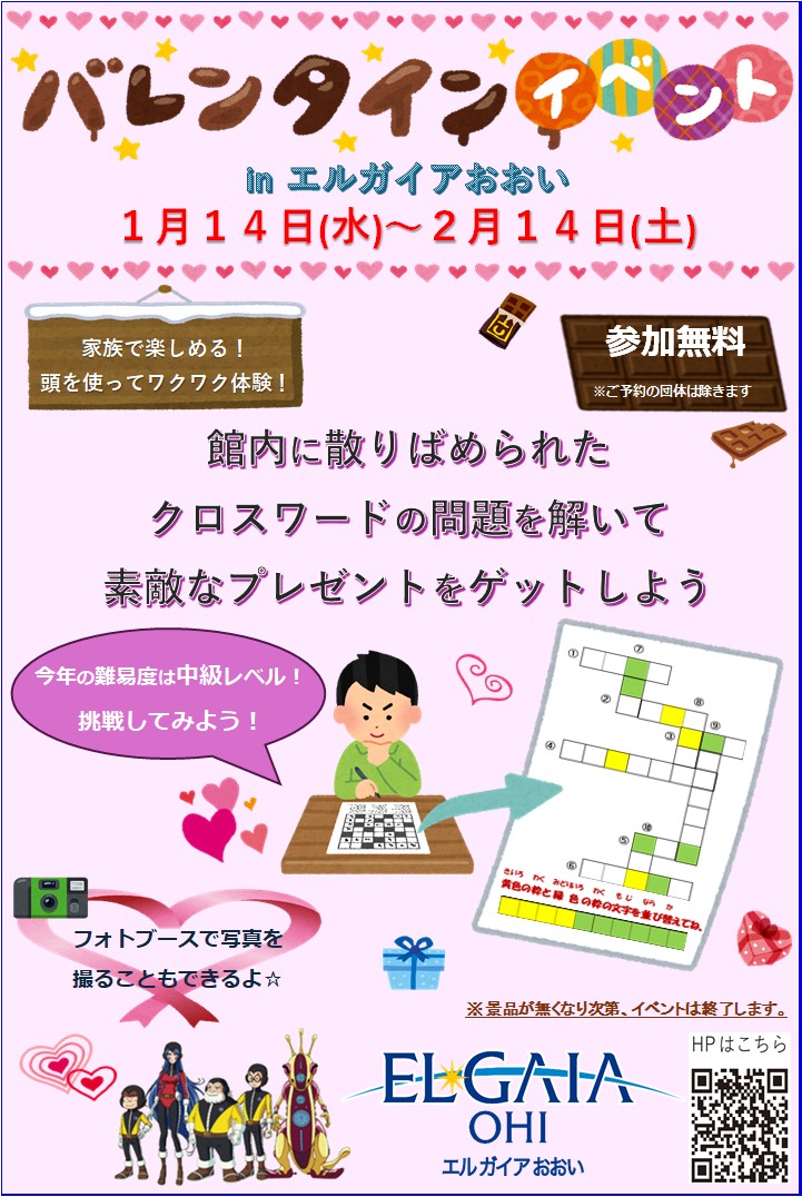 2026/01/14 エルガイアおおい バレンタインイベント(クロスワード) 館内に散りばめられたクロスワードの問題を解いて素敵なプレゼントをゲットしよう! ※景品がなくなり次第、イベントは終了とさせていただきます。 【お問い合わせ先】 エルガイアおおい TEL0770‐77‐2144