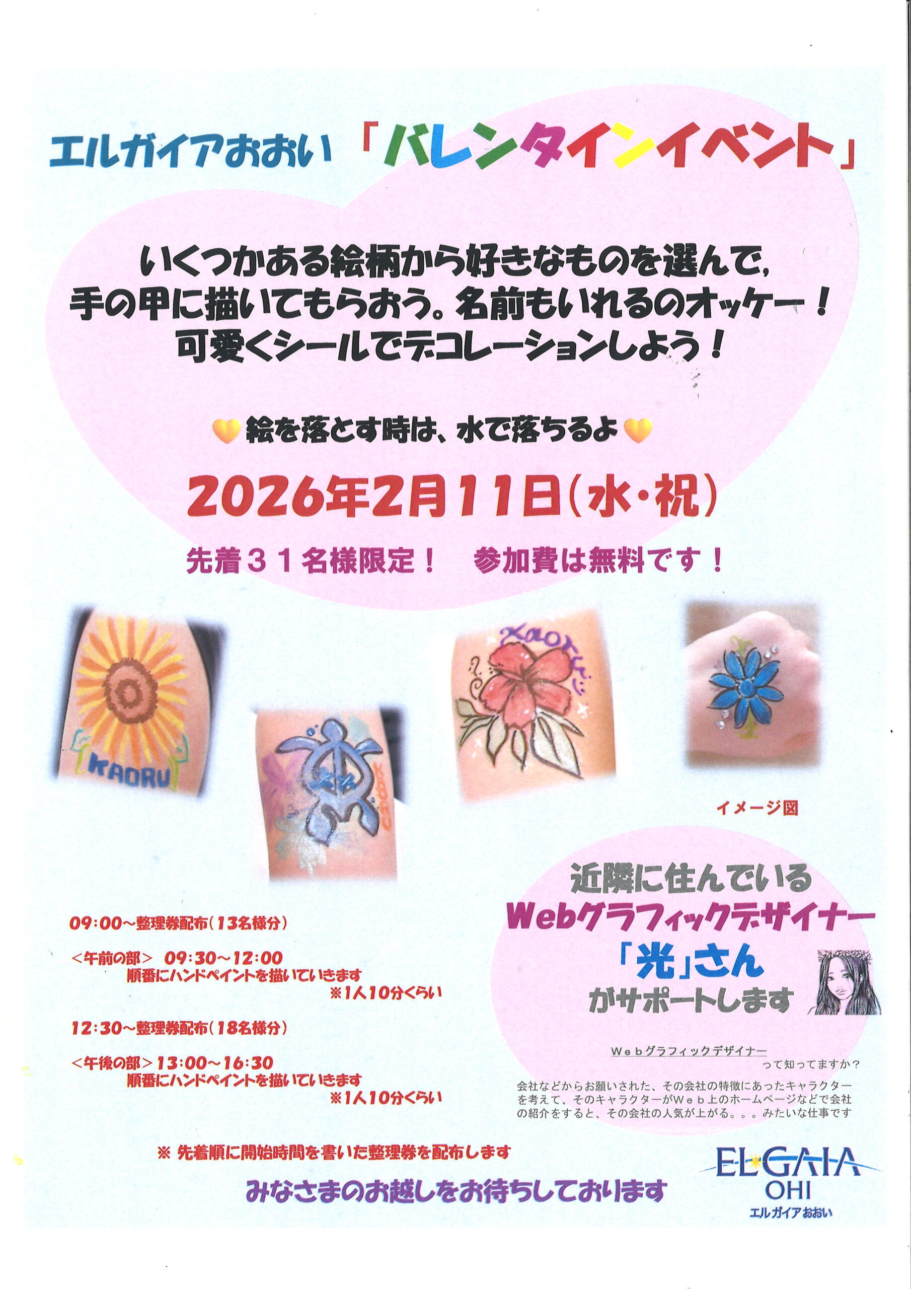 2026/01/14 エルガイアおおい バレンタインイベント(ハンドペイント) いくつかある絵柄から好きなものを選んで、手の甲に描いてもらおう。 その後、可愛くシールでデコレーションしてね。 ※イベント当日、先着、31名様に整理券をお渡しします。 【お問い合わせ先】 エルガイアおおい TEL0770‐77‐2144
